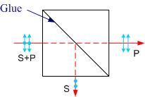 偏振分束立方體 將隨機偏振光束分成兩束正交的線偏振光,S偏振光以90度角反射,P偏振光透射,每個分束器由一對精密高公差直角棱鏡膠合而成,其中棱鏡的斜邊鍍有介質(zhì)分光膜。