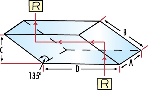五角棱鏡 無需反轉(zhuǎn)或倒置即可使入射光束偏轉(zhuǎn)至90&deg;,90&deg;的偏轉(zhuǎn)角與棱鏡繞平行于兩個反射面交線的軸的任何旋轉(zhuǎn)無關(guān),它常用于鉛垂線、測量、對準(zhǔn)、測距和光學(xué)工具。